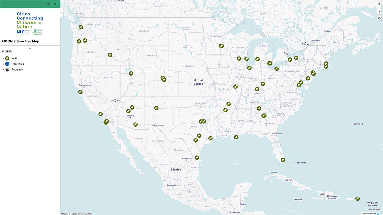 More than 50 U.S. communities take part in Cities Connecting Children to Nature (CCCN), our joint initiative with the National League of Cities. In 2022, we supported these communities in greening schoolyards; connecting families to the outdoors through Nature-Smart Libraries; enhancing public spaces with nature play areas; advancing nature connection in early childhood; and more. This interactive map highlights nature-based strategies being implemented by CCCN cities across the nation.