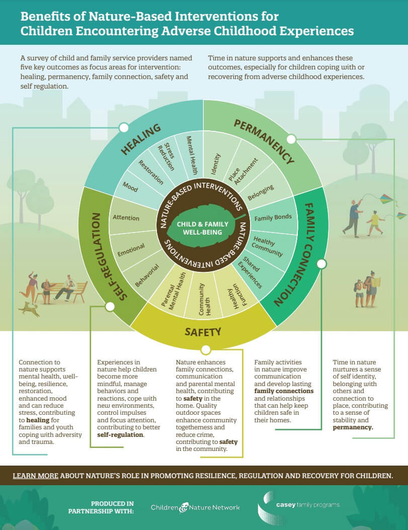 Throughout 2022, we partnered with Casey Family Programs to equip social workers across the U.S. with nature-based strategies to support families and children in crisis. The partnership allows us to apply what we know about the restorative power of nature as a counterbalance to the negative health and developmental impacts of Adverse Childhood Experiences (ACEs). Through monthly workshops, conference presentations, resource development and technical assistance, we helped Casey Family Programs incorporate nature-based interventions in their training and service models to improve the health and well-being of children and families.