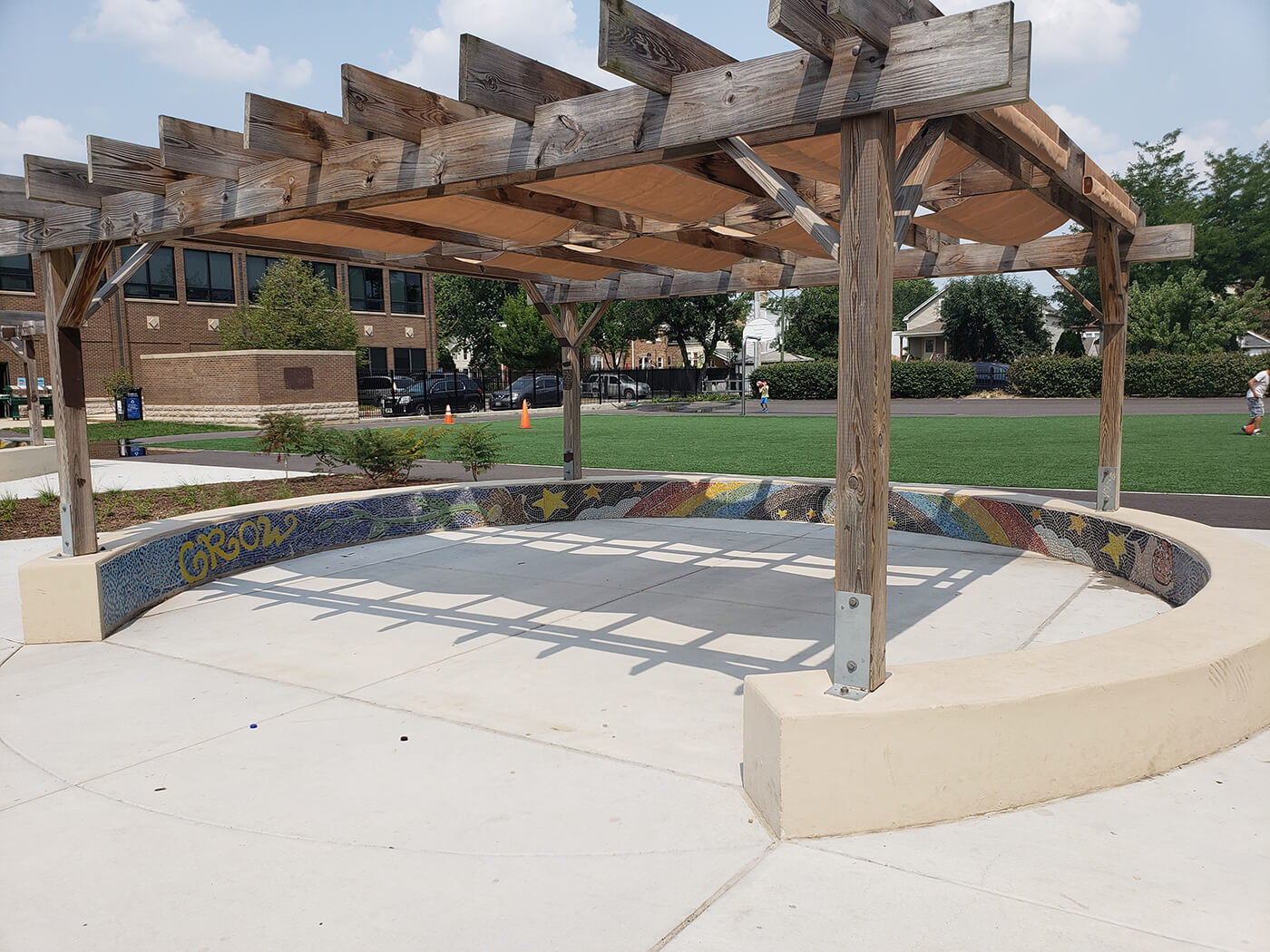 - Built and natural shade: pergolas, pavilions, sails and shade trees that cool outdoor play areas
