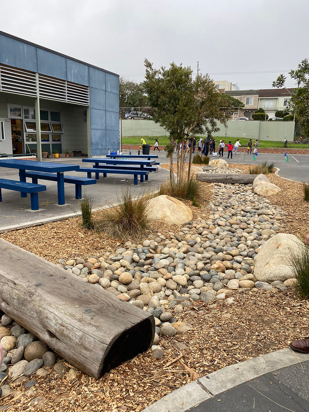- Managing stormwater through green infrastructure: Rain gardens, bioswales and permeable paving help manage flooding while serving as hands-on learning areas that connect children directly to natural systems.
