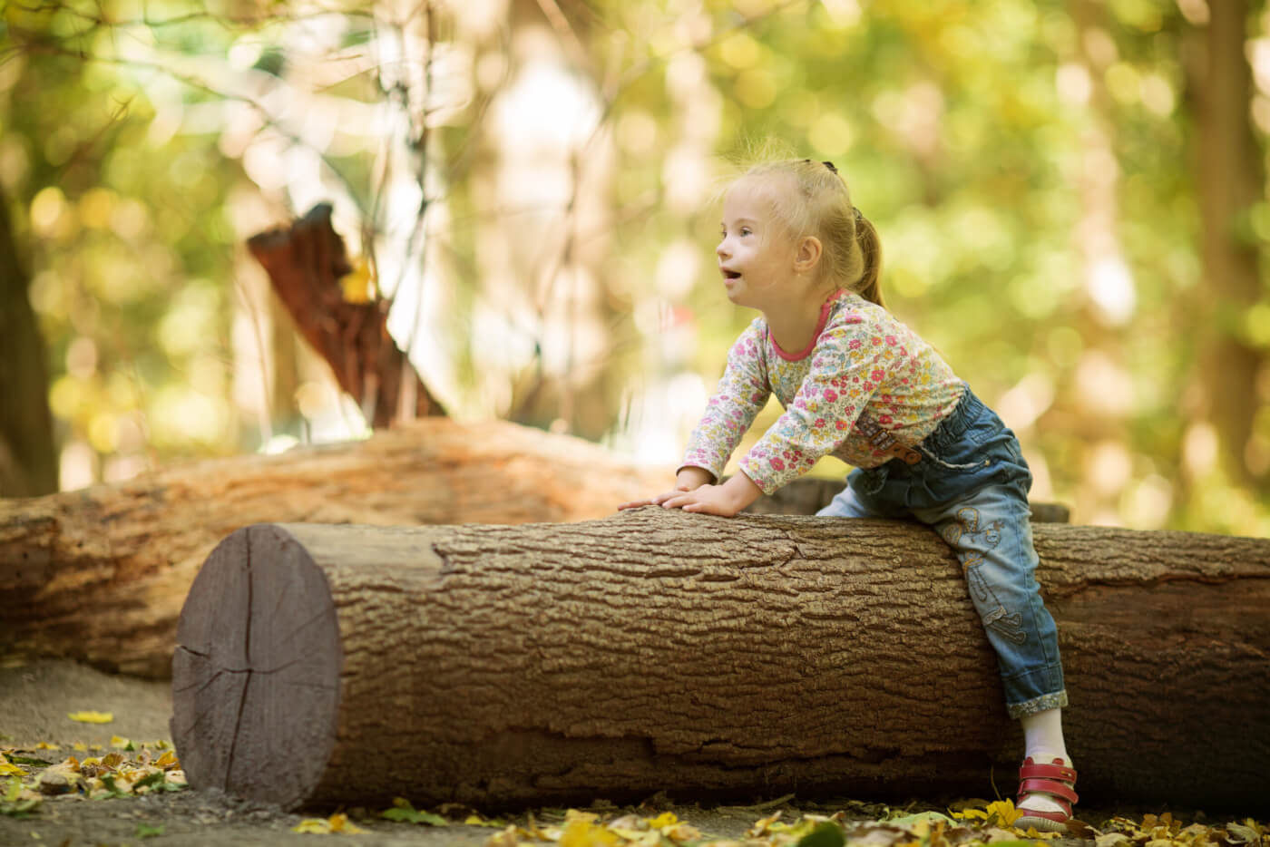 funny little girl with Down syndrome sitting on a large log