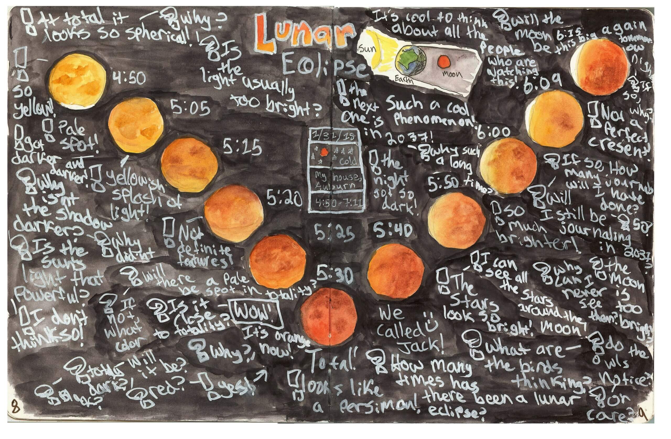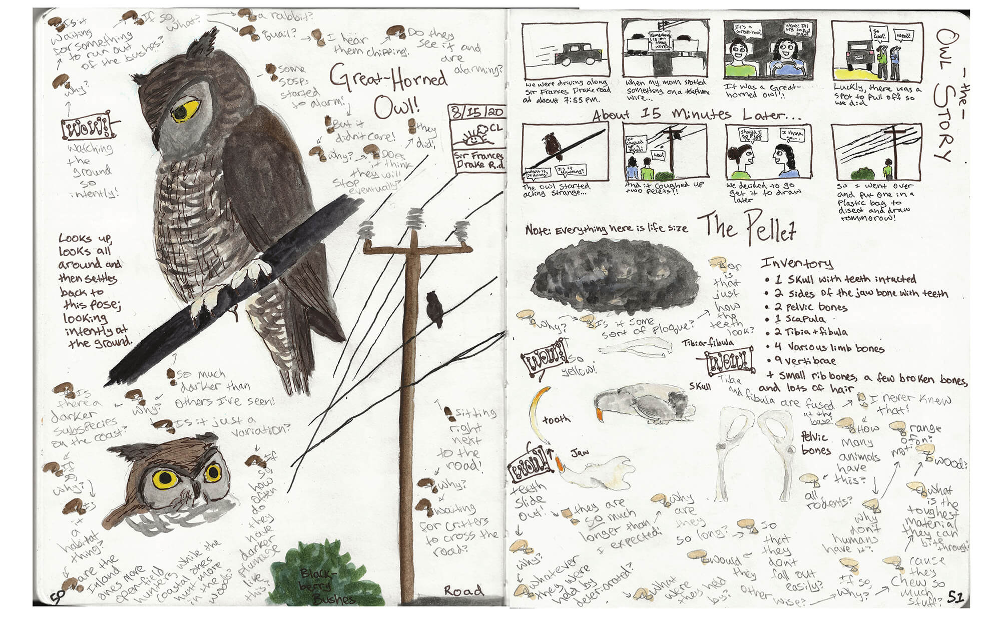 When I was thirteen, I had a chance meeting with author, artist, educator and naturalist John Muir Laws. He introduced me to nature journaling and my life was forever changed. Nature journaling is taking a notebook and some simple art supplies out into nature and using words, pictures and numbers to describe what you notice, what you wonder about and what things remind you of. What really drew me to nature journaling is that it combines two of my favorite things: art and nature. After meeting John Muir Laws, I immediately started my first nature journal and began to fill it with sketches and notes about the many wonders of nature that I saw around me. Since my thirteenth birthday, nearly five years ago, I have created more than two thousand journal pages—filled with sketches, diagrams, maps, paintings, observations and questions.