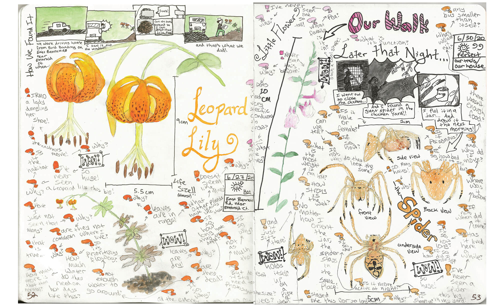 When I journal, I notice more, and the more I notice, the more fun it gets. Let’s say I’m drawing a wildflower: I have to look at it very closely and by doing that, I might notice something interesting about how the petals attach. That might spark a question that gets me very excited and curious about this little flower. I wouldn’t have gotten so excited about it if I hadn’t stopped to wonder about it. Journaling also helps me to articulate my thoughts and questions on paper. Once I write down what I am thinking, I no longer have to keep holding that thought in my mind and then my mind is free to think of more things. This also allows me to look at my thoughts and questions on paper and make connections between them. This practice of journaling has benefited me in other parts of my life as well. I recently took an honors botany class where we did a lot of careful drawing and learning about the plants through artistic observation. Since I had spent so much of my time doing just that, this class was so much fun for me to attend.