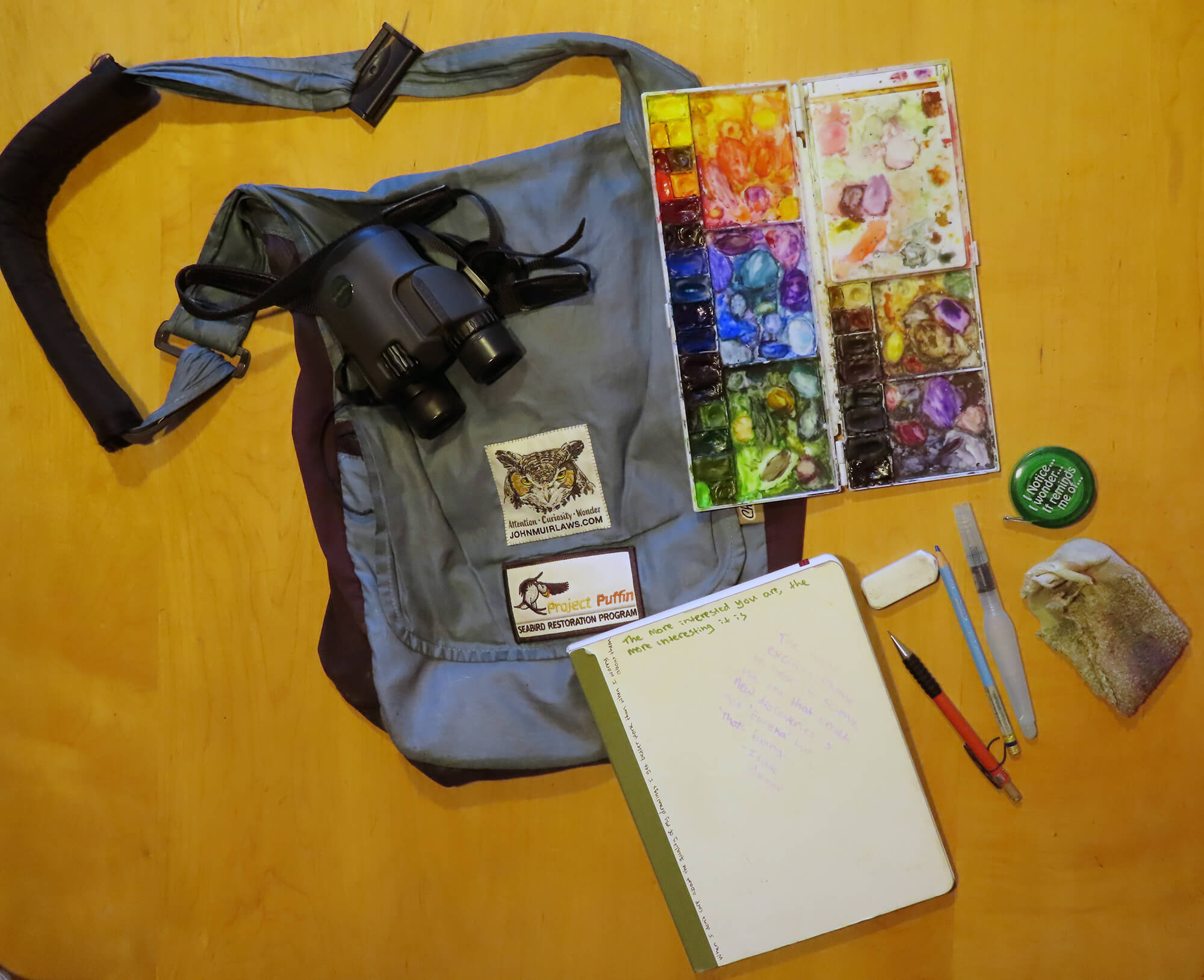 My kit for journaling is fairly simple and I keep it all together in a lightweight bag hanging by the front door so it is easy to take with me whenever I head out on a nature adventure. I have a hardcover journal with thick paper and an assortment of pencils, brushes and pens, as well as a watercolor palette. I also have a lightweight pair of small binoculars that work for birding but also have a short focal length and enable me to closely study flowers and bugs. One of my favorite tools is a non-photo blue pencil. This pencil is very pale, and I use it to block out the general shapes of what I’m drawing. Since it is so pale, it is easy to stay loose with the drawing and change the lines if I want. Once I’ve got a shape I like, I move to a mechanical graphite pencil and go over the lines that I want to keep. Then I will usually paint what I drew and give the page a title. Next, I add some metadata in a little box, which includes where I am, what the weather is like and the date. Finally, I start writing down my observations and questions.