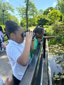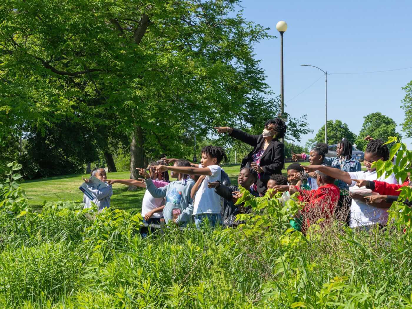 Students from Beidler Elementary School share the thrill of a bird sighting while exploring a water habitat. Photo by Jessica Fong, courtesy of Openlands.
