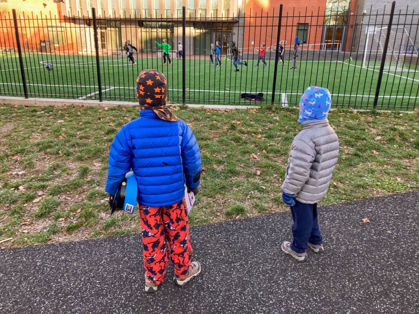 As preschoolers, my two young boys would hang longingly outside the fence of our neighborhood public school and ask if they could join the pickup soccer game. When they finally enrolled, they gleefully trotted out to join the “big kids” sprinting around the plastic soccer turf, which occupies roughly two-thirds of the schoolyard playspace. I remember vividly my then 5-year-old’s first words when he stepped off over an hour later: