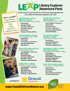 In addition to offering in-house nature experiences, libraries are encouraging more people to explore the outdoors. By providing lendable “Library Explorer Adventure Packs,the Texas Children in Nature Network is helping new families visit Texas parks and natural areas. The backpacks include nature books, tools for safe outdoor exploration and free passes to places such as state parks, local zoos and nature centers.