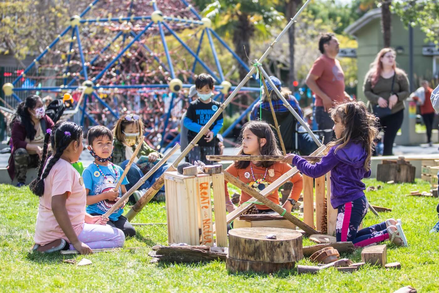 San Francisco Public Library hosts an annual Día de los Niños, Día de los Libros event that brings families to a local park for nature-based activities, including yoga, nature play elements, a bookmobile, Roving Rangers and more. Photo courtesy of SF Children & Nature.
