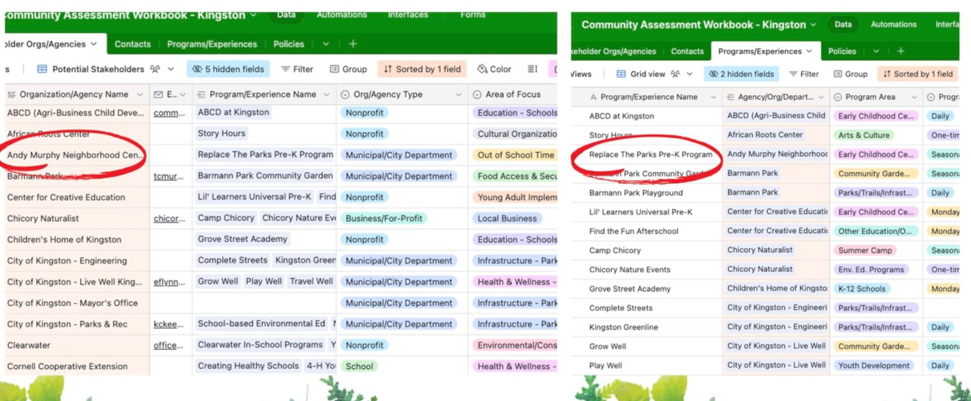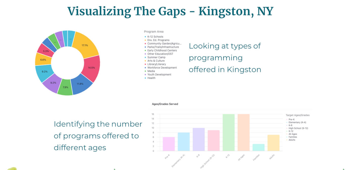 The team collected all that data in a spreadsheet using Airtable, a free cloud-based program that enabled them to generate charts and visualize the opportunities Kingston youth have to access the benefits of nature — as well as any gaps. For example, a bar chart of programs sorted by age revealed that Kingston offers a lot of nature programming for elementary and middle school students, but not much for families.