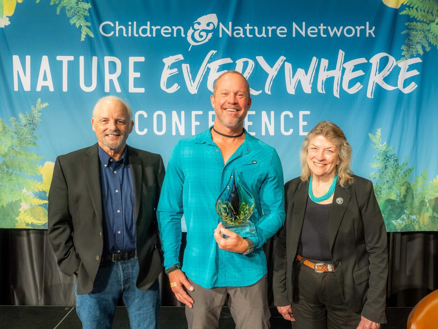 Co-founders Richard Louv and Cheryl Charles pose with Jason Stout, 2024 Richard Louv Prize awardee.