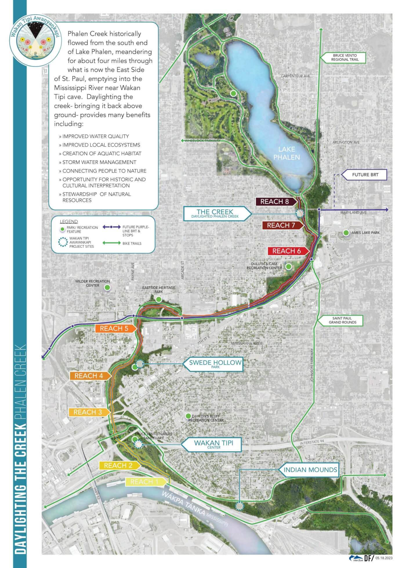 The ultimate goal of Wakaŋ Tipi Awaŋyaŋkapi’s initiative is a four-mile stretch of daylit creek that reconnects Wakpá Taŋka with Phalen Lake. “It’s going to provide a really amazing green corridor for people to access,” says Menomin, “and we’re planning in our design, obviously, for people to have a chance to be able to go and touch the water.”