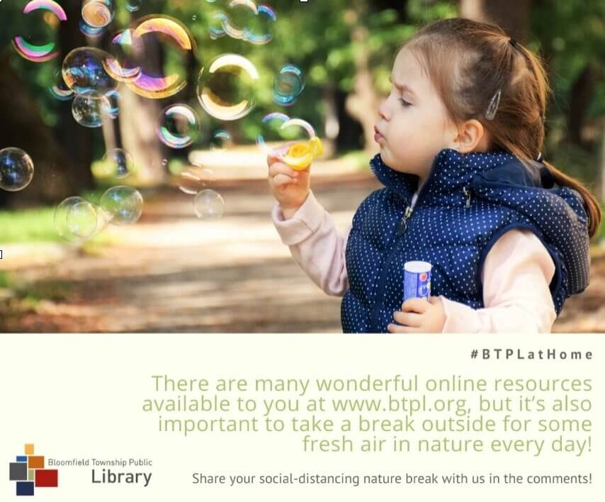 Beyond specific programs, librarians have using social media to remind their communities to take breaks in nature. The Bloomfield Township Public Library in Michigan says “Take time to see spring coming to Bloomfield Township. What did you notice today?”