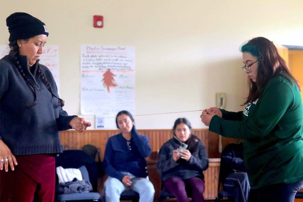 Valentina and Litzy practice the tradition of braiding sweetgrass using rafea.