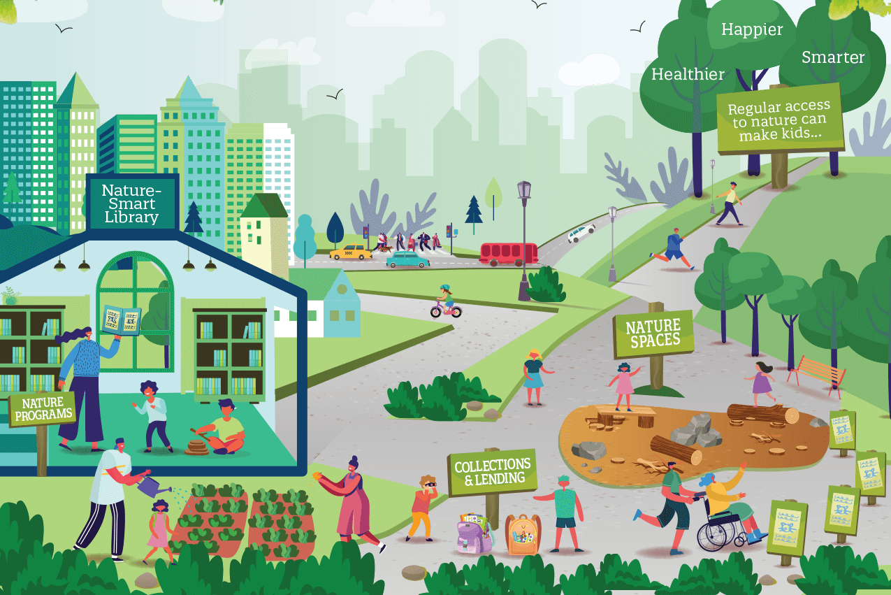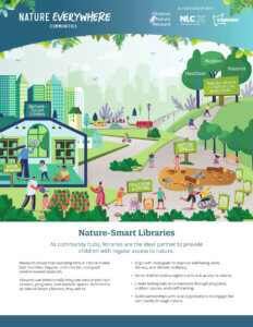 As community hubs, libraries are the ideal partners to provide children with regular access to nature. This infographic provides a helpful visual of how libraries can help connect children to nature. Use this to help build understanding of Nature-Smart Libraries.