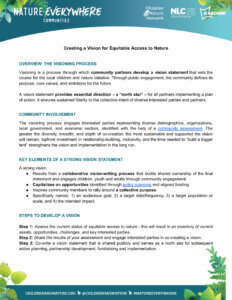 This resource aims to support a visioning is a process through which community partners develop a vision statement that sets the course for the local children and nature initiative. Through public engagement, the community defines its purpose, core values, and ambitions for the future.