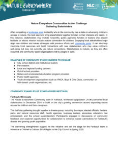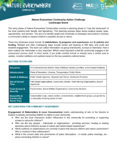 The early phase of Nature Everywhere Communities involves a planning phase to “map the landscape” of the local systems both literally and figuratively. This planning process helps teams analyze assets, gaps, opportunities, and barriers. This resources provides a high-level view of what to consider when doing landscape scans for stakeholders, programs and experiences, and policies and funding in a community.