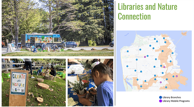 San Francisco is a community of many cultures. Libraries are uniquely positioned as community pillars that can service patrons in their language, with a shared understanding of culture. With 28 branches and access to two National Parks, the city invested in programs like bookmobiles, Little Free Libraries in parks, and Summer Stride reading initiatives. These initiatives were made possible through partnerships with the National Park Service, Golden Gate National Parks Conservancy, Presidio and city agencies. Libraries have been able to shift attitudes toward nature and increase engagement.