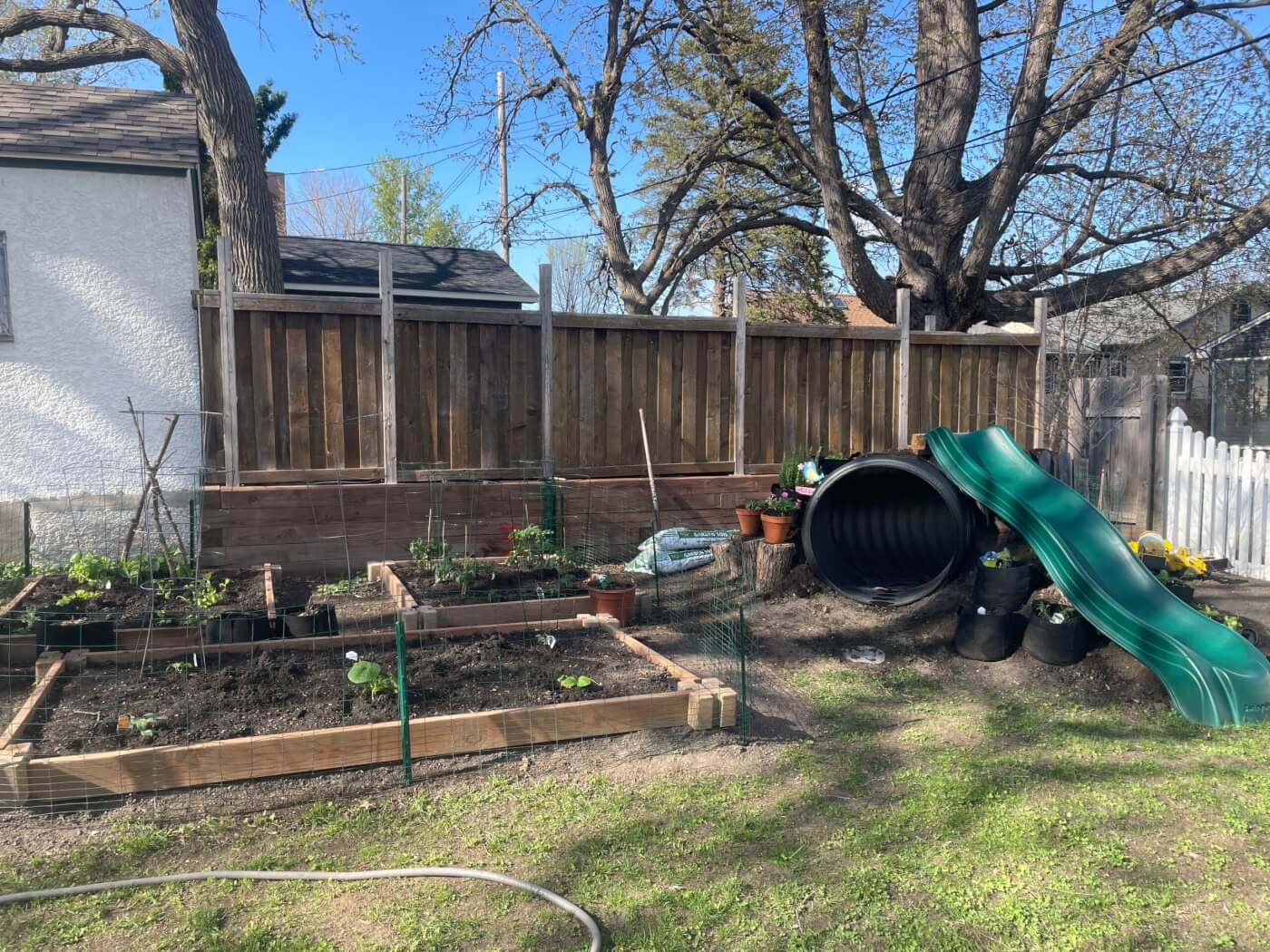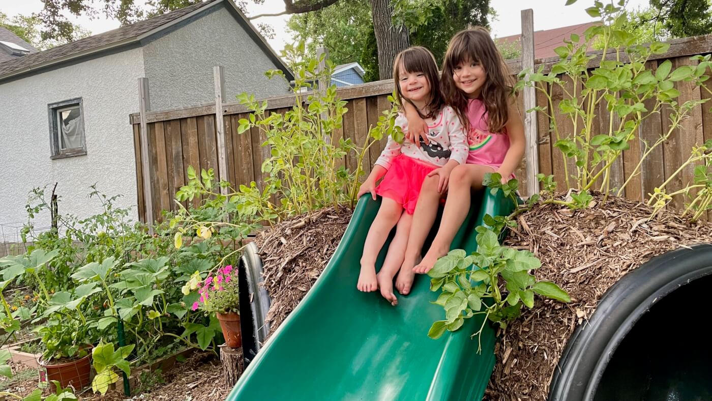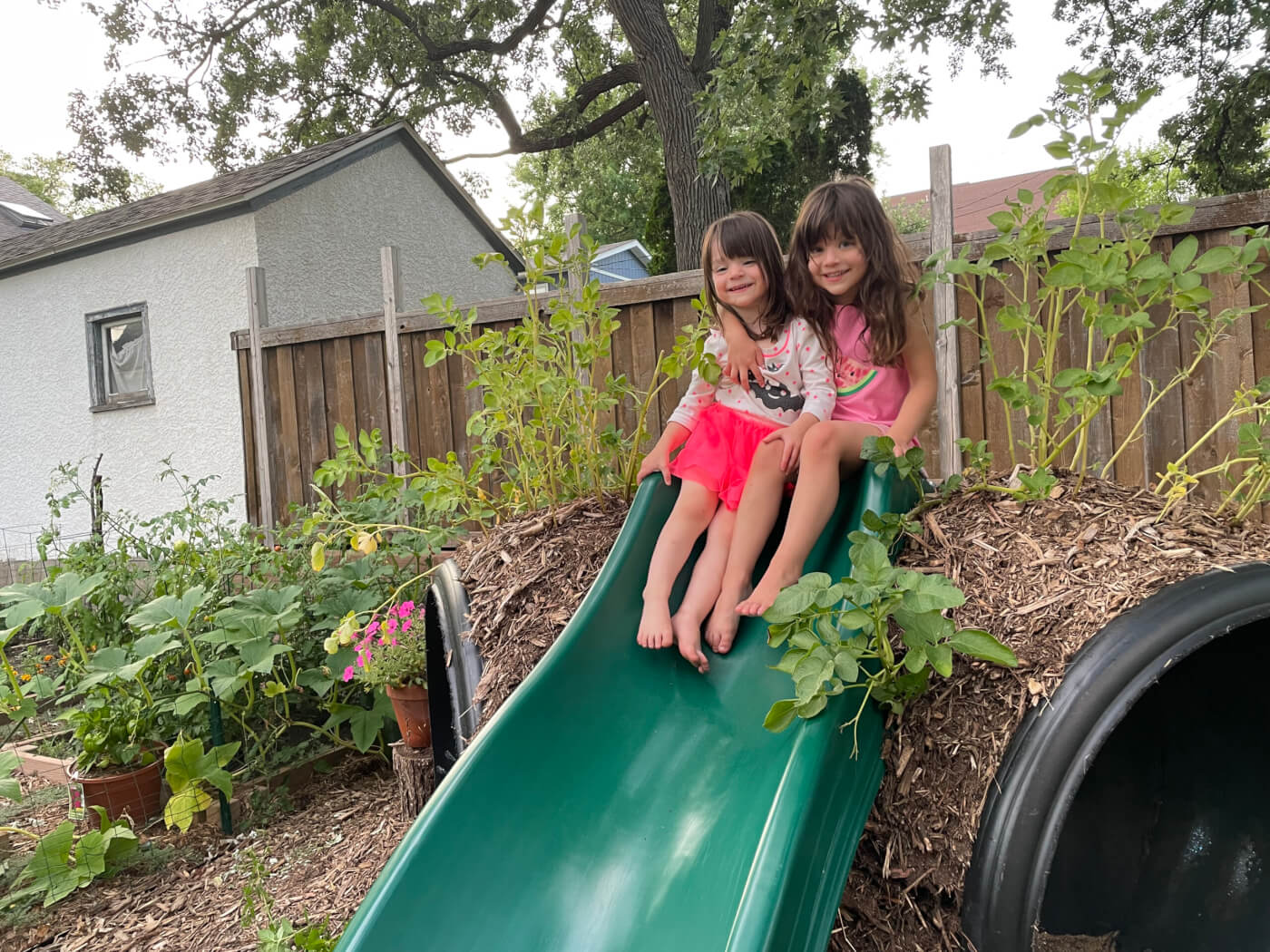 We got the logs for the steps from a tree that was being taken down on our boulevard and the slide was repurposed from a neighbor whose kids had outgrown their play structure.