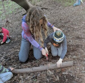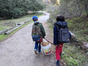 Two children work together to carry firewood during an outdoor OT session. This experience provides proprioceptive input, also known as “heavy work,” giving deep input to joints and calming the children’s nervous systems, while also allowing the children to work as partners together to help the group.