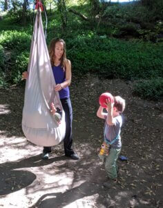 A small-group setting for nature-based therapy allows children to learn to listen to their peer’s requests while playing a ball game in the swing, facilitated by the occupational therapist.