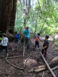 Children work together to problem solve how to create a fort using large sticks during an outdoor group OT session. The therapist addresses children’s social-emotional and motor goals throughout this small-group experience.