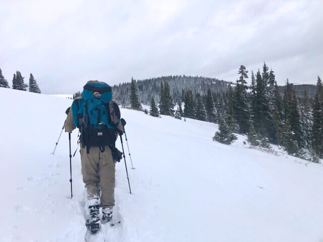 Sammy hikes across a snowy mountainside while on a WYP snowshoeing trip. Photo by Wild Youth Passages.