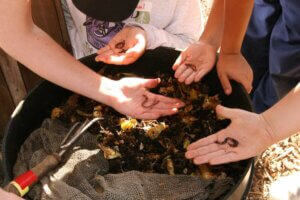 Students investigate a vermicompost (worm compost) pile. Photo courtesy of Life Lab.