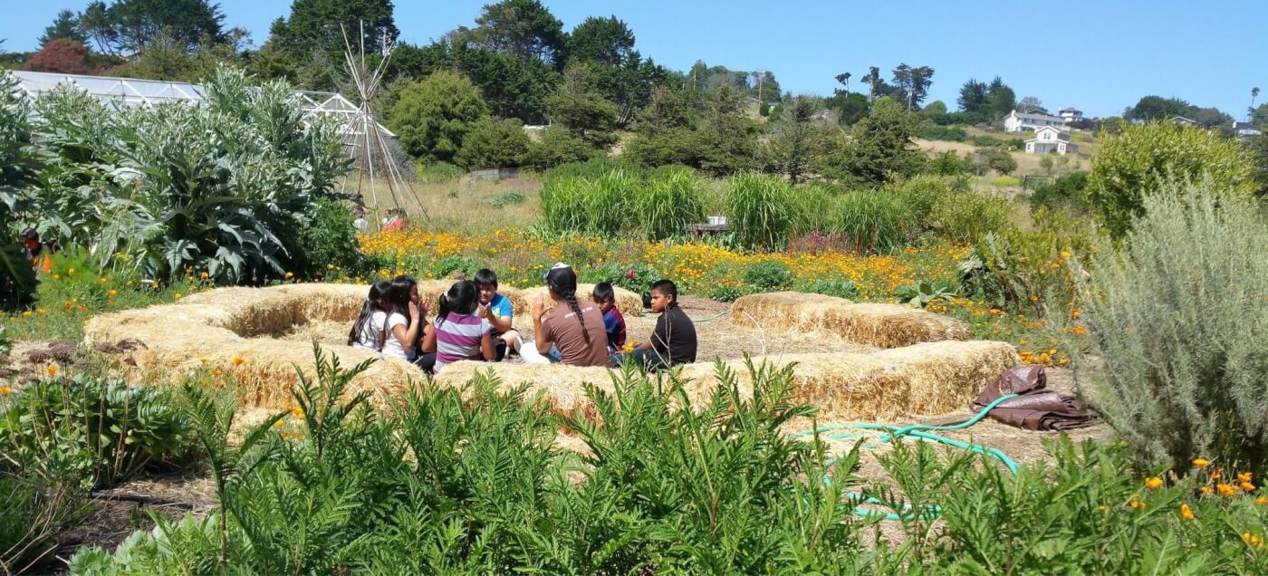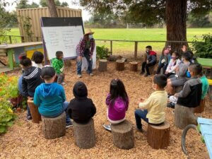 Class time in the outdoor garden classroom at PVUSD’s Amesti Elementary School in Watsonville, CA. Photo courtesy of Life Lab.
