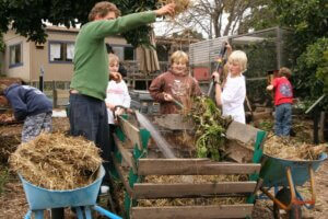 Building muscles while building compost. Photo courtesy of Life Lab.