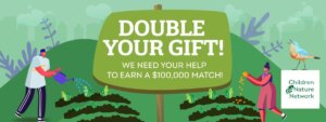 A Children & Nature Network board member has just provided a $100,000 matching grant to help us meet our year-end fundraising goal. This is the largest matching grant in our history. All gifts made by midnight, December 31, 2024, are eligible. Your gift will be matched dollar-for-dollar, doubling your impact. Plus, a gift of any size makes you a member of the Children & Nature Network, with special perks!
