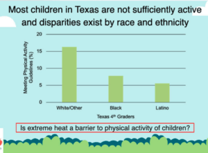 Environmental assessments conducted in three school parks in low-income communities in Texas found extreme heat conditions and significant differences in heat index across park sites, with tree canopy accounting for the differences. Observations of children in the parks showed that they positioned themselves under trees during periods of high heat index for thermal comfort.