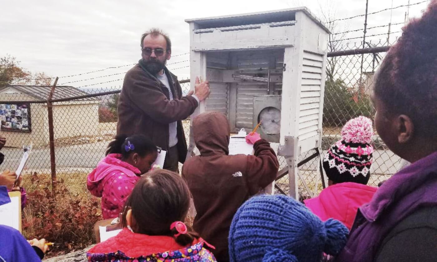 A guide from the National Oceanic and Atmospheric Administration shows Steam Beans participants a weather station at Great Blue Hill.