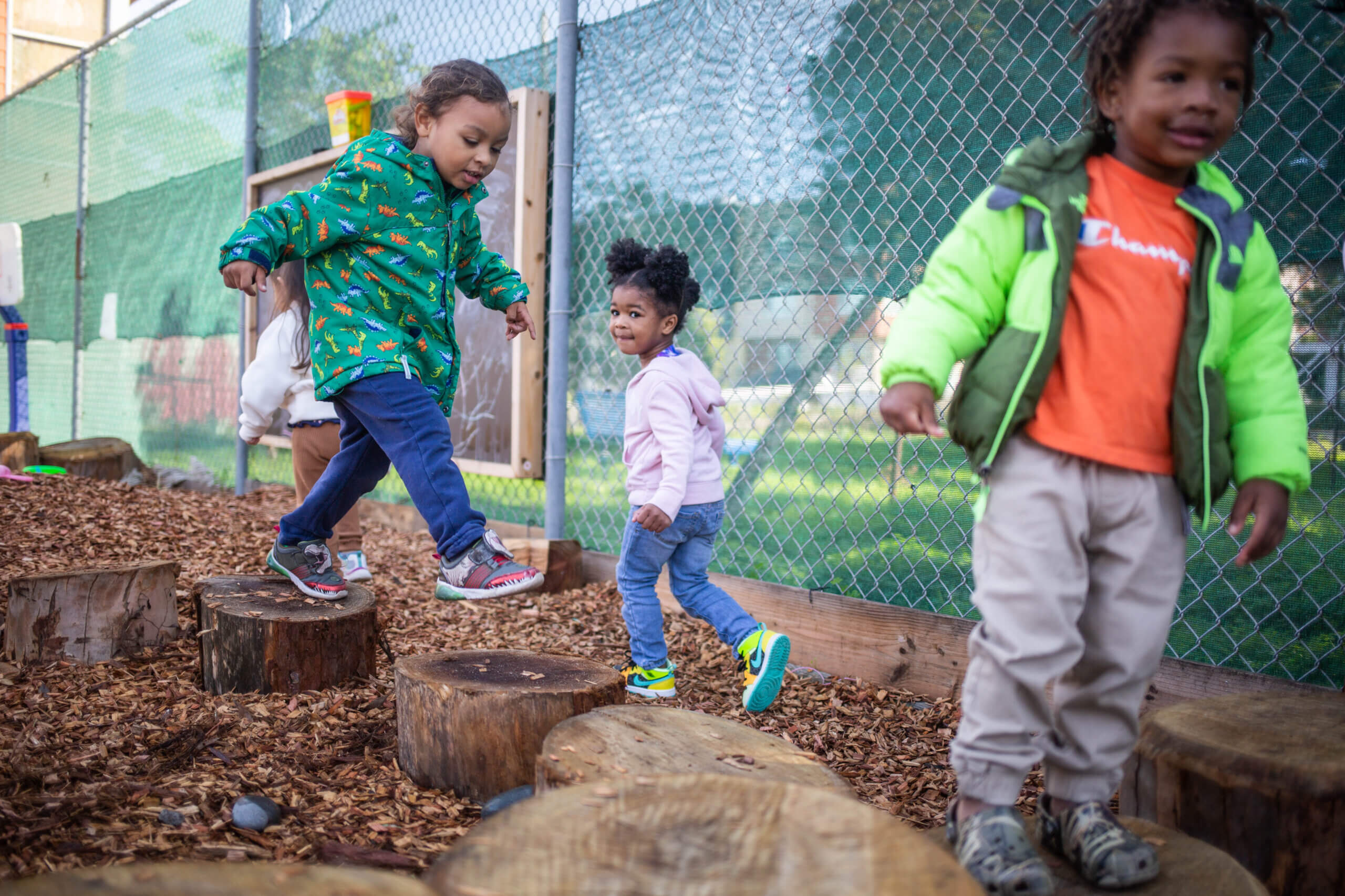 A 4-year-old boy pounds a branch on a round slice of tree trunk, known as a “tree cookie.” Realizing he can make music, he smiles and begins to pound in rhythm. Across the yard, another group of preschoolers follow a teacher along a log on the ground. The kids hold their arms wide, balancing and following directions. Ahead of them are children who are jumping from rock to rock, squealing as one kid yells, “Ground is lava!”