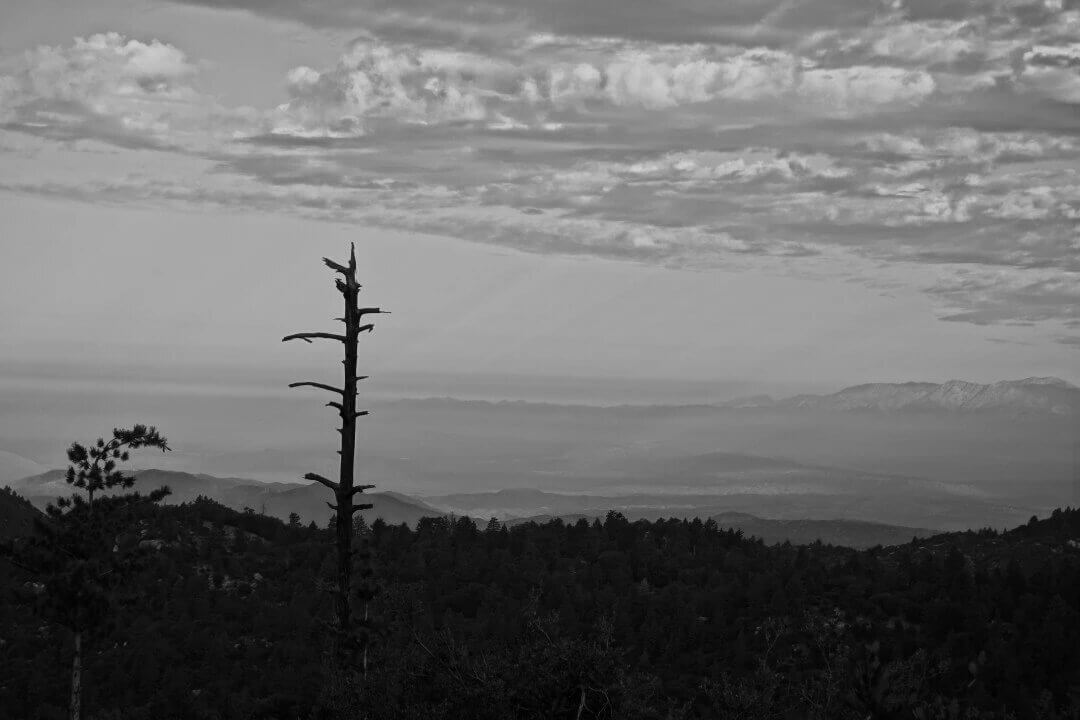 The weather was perfect; it forced us indoors. The air was brittle with cold. Through our cabin’s front windows, we watched the slate clouds race across the San Jacinto range to embrace Tahquitz peak. On the upper slope of that mountain is a jutting rock with its own story, of a chief named Tahquitz who, after death, turned monstrous and still perches — right there — waiting.