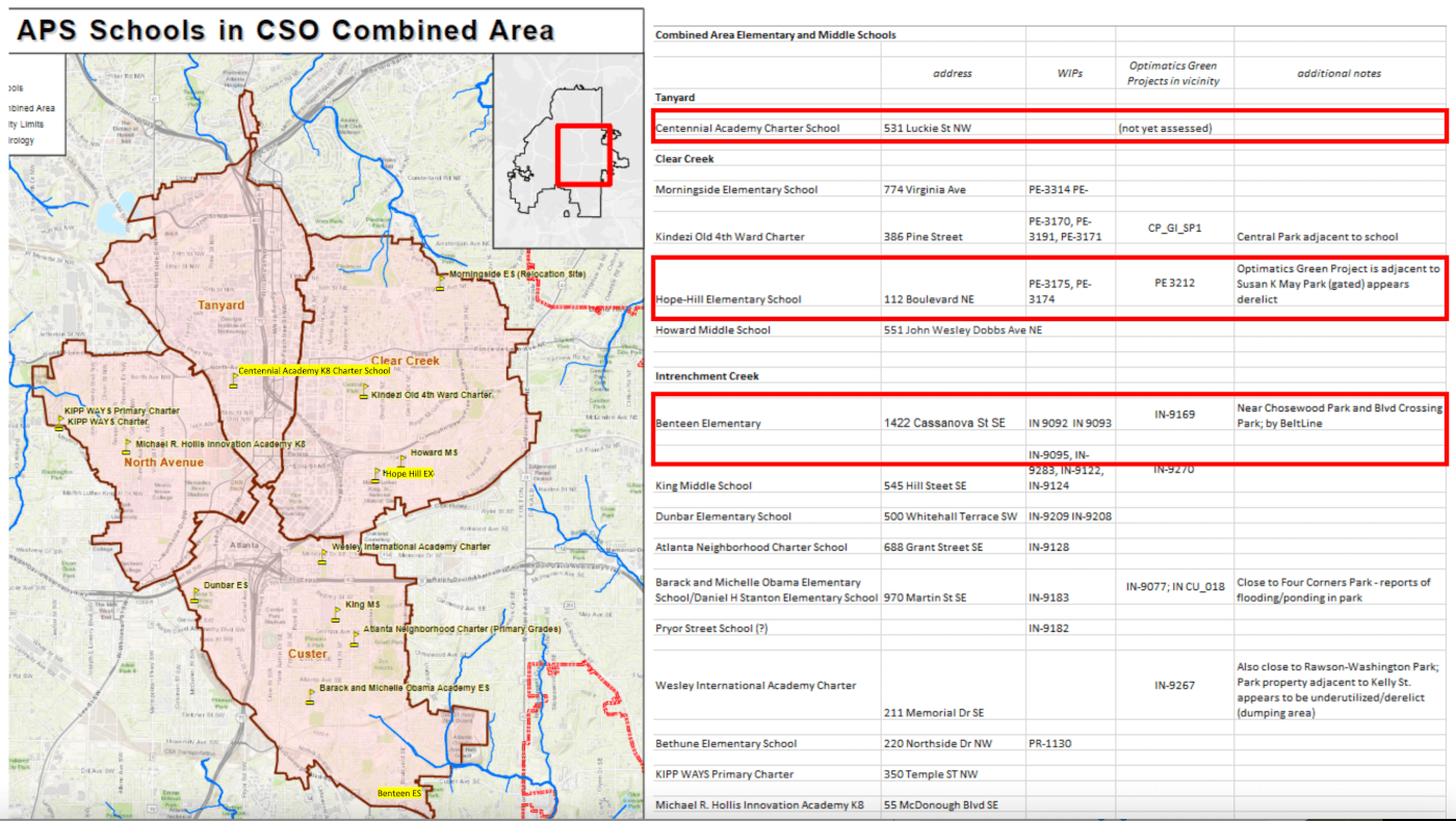 In order to identify priority schoolyard development sites, the Atlanta Department of Watershed looked at where Watershed Improvement Plan projects, schools in combined sewer areas and reports of flooding overlapped. Photo by Tamara Graham, Office of Watershed Protection, Atlanta Department of Watershed Management.