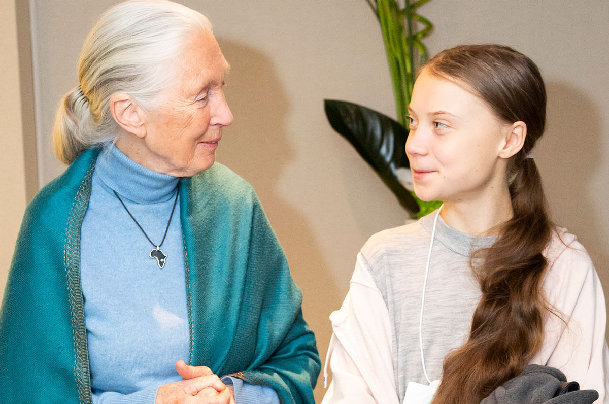 Greta Thunberg, climate and environmental activist, meets Jane Goodall, Founder, Jane Goodall Institute; UN Messenger of Peace, at the World Economic Forum Annual Meeting 2020 in Davos-Klosters, Switzerland. Photo credit: “World Economic Forum Annual Meeting” by World Economic Forum with CC BY-NC-SA 2.0.